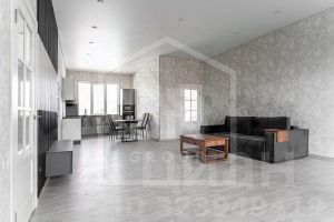 — Просторная гостиная с современной кухней.