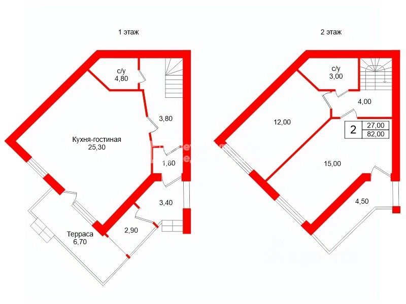 2 санузла, сауна на первом этаже, 2 спальни на втором этаже.