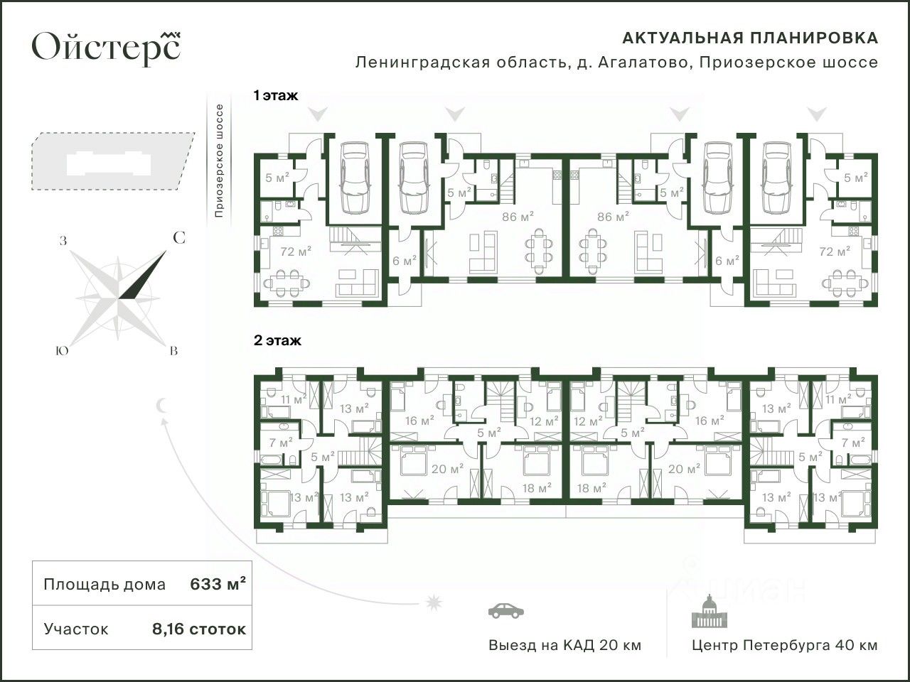 Дом построен в 2025 году и разделён на четыре автономных сектора (таунхауса) площадью 144, 145, 171 и 173 м² соответственно. Каждый сектор имеет отдельный вход, подъезд, собственную котельную с двухконтурным газовым котлом и встроенный тёплый гараж на одно машиноместо.