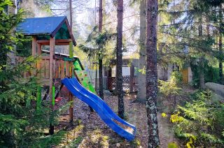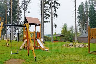 Зона въезда вымощена плиткой. На участке имеется уличное освещение, оборудован небольшой пруд с мостиком, детская площадка, выполнен ландшафтный дизайн, при этом, бережно сохранены деревья, а белые грибы можно собирать прямо на участке.