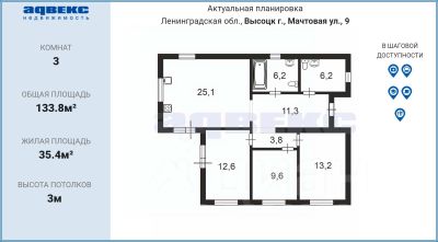 Планировка: Светлая кухня-гостиная 25,1 кв.м., три изолированные комнаты (13,2 + 12,6 + 9,6 кв.м.), просторная прихожая, санузел.