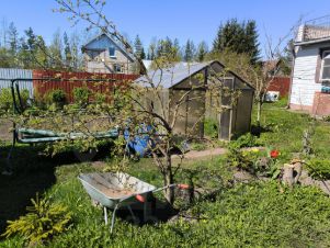 Участок ИЖС разработан, ухожен, есть фруктовые деревья, кусты, теплица. Забором из профлиста.