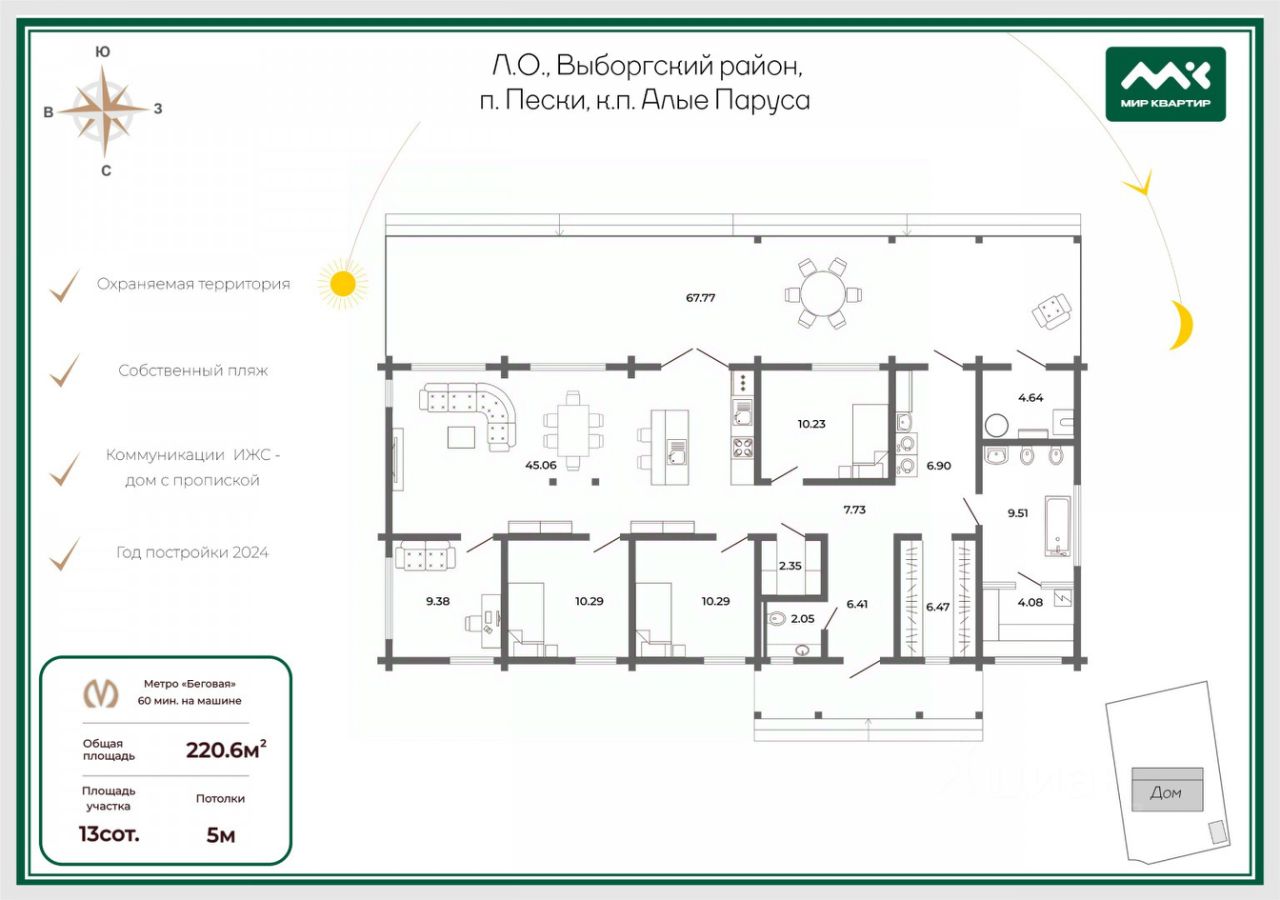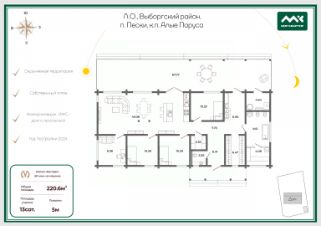 Арт. 123147593 Ваш идеальный дом ждет вас: гармония стиля и уюта в окружении природы. Представьте себе место, где каждая деталь продумана для вашего комфорта, а архитектура сливается с природным ландшафтом. Этот дом воплощение минимализма, где функциональность и эстетика идут рука об руку. Односкатная крыша, панорамные окна, просторная терраса все это создает ощущение свободы и единения с окружающим миром. Тепло дерева и душа в каждой детали. Этот теплый, деревянный дом из бруса создан с любовью и заботой. На одном этаже расположилась продуманная планировка, центром которой стала просторная кухня-гостиная с захватывающими панорамными окнами. Здесь будет уютно как в будничные вечера, так и во время шумных семейных праздников. Что делает этот дом особенным: Простор и свет: 135 м² жилой площади, наполненной светом, с впечатляющей гостиной, которая станет сердцем вашего дома. Личное пространство для каждого: Четыре изолированные спальни гарантируют уединение и комфорт всем членам семьи. Летние вечера на террасе: Большая терраса идеальное место для ужинов под открытым небом или расслабляющего отдыха после посещения сауны. Релаксация в собственной сауне: Погрузитесь в атмосферу тепла и уюта, забыв о повседневных заботах. Практичность и порядок: Два санузла и отдельная постирочная комната обеспечат удобство и чистоту. Все под рукой: Удобная кладовая при кухне позволит держать все необходимое в порядке. Забота об автомобилях и снаряжении: Отдельный хозяйственный блок с навесом на два автомобиля, а также место для хранения велосипедов и другого инвентаря. Единение с природой: Высокие сосны и живописный черничник вокруг дома создают атмосферу умиротворения. Забудьте о бесконечной стрижке газона наслаждайтесь природой! Близость к воде: Всего в 15 минутах от дома Финский залив идеальное место для летнего отдыха и купания. Этот дом для тех, кто ценит простор и свободу. Представьте, как вы вместе с друзьями лепите пельмени или нарезаете салаты вокруг кухонного острова, а на экране яркие воспоминания о путешествиях. Дети спят, а вы наслаждаетесь бокалом вина на террасе идеальный вечер. Ощутите тепло дерева, умиротворяющий шум дождя по крыше и завораживающий панорамный вид. Этот дом словно обнимает вас, даря ощущение полного покоя и гармонии. Технические детали: Статус: ИЖС (возможность прописки). Участок: 12.9 соток. Общая площадь дома: 220,6 м² (жилая 135,29 м², терраса 77,34 м²). Количество комнат: 5. Этажность: 1. Хозблок и парковка: 60,40 м². Материал стен: Клееный брус экологичный, "дышащий" материал, требующий минимальной отделки. Крыша: Кликфальц надежное и долговечное решение. Фундамент: Финская плита проверенное качество. Год постройки: 2024. Преимущества расположения: Поселок "Алые паруса" предлагает высокий уровень комфорта: охрана, собственный пляж, подземные коммуникации, асфальтированные дороги и освещение. В шаговой доступности магазины, аптеки, рестораны. Школы и детские сады находятся всего в 10 минутах езды. До города меньше часа пути. P.S. Дом строился для себя, но обстоятельства изменились. Возможен обмен на квартиру с вашей доплатой. Предлагаем ПРЕМИАЛЬНОЕ обслуживание для требовательных клиентов. Оперативно организуем просмотр, предоставим полную информацию по объекту. 20 лет работы с требовательными клиентами подготовили нас к решению ВАШ