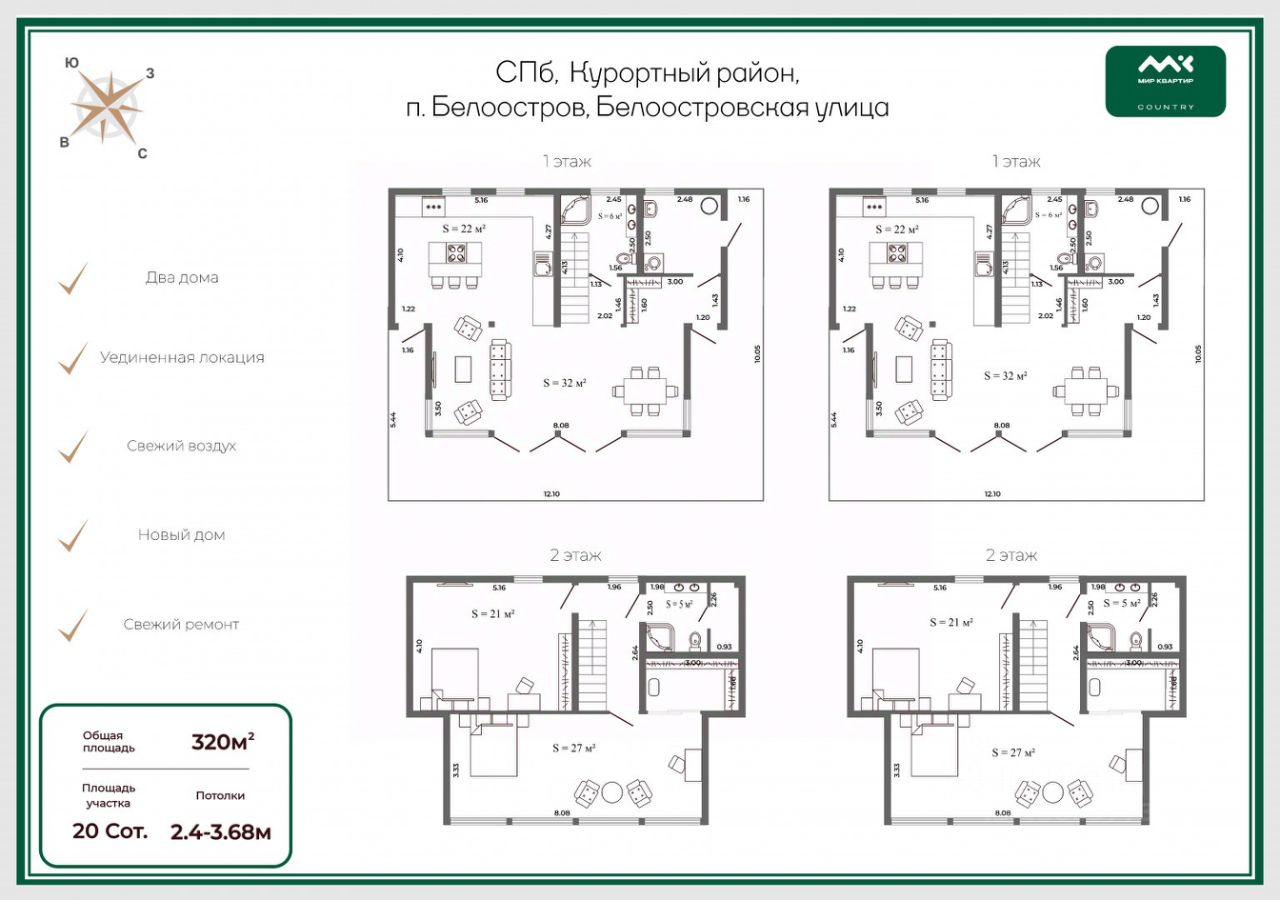 Дома из клееного бруса, абсолютно идентичные, по 160 м² каждый. Отремонтированы и укомплектованы кухнями. Установлены бойлеры. На полу кварцвинил и тёплые полы по всей площади.
