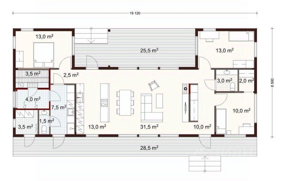 две террасы общей площадью более 50 м² — одна для завтраков на свежем воздухе, другая для вечерних посиделок.