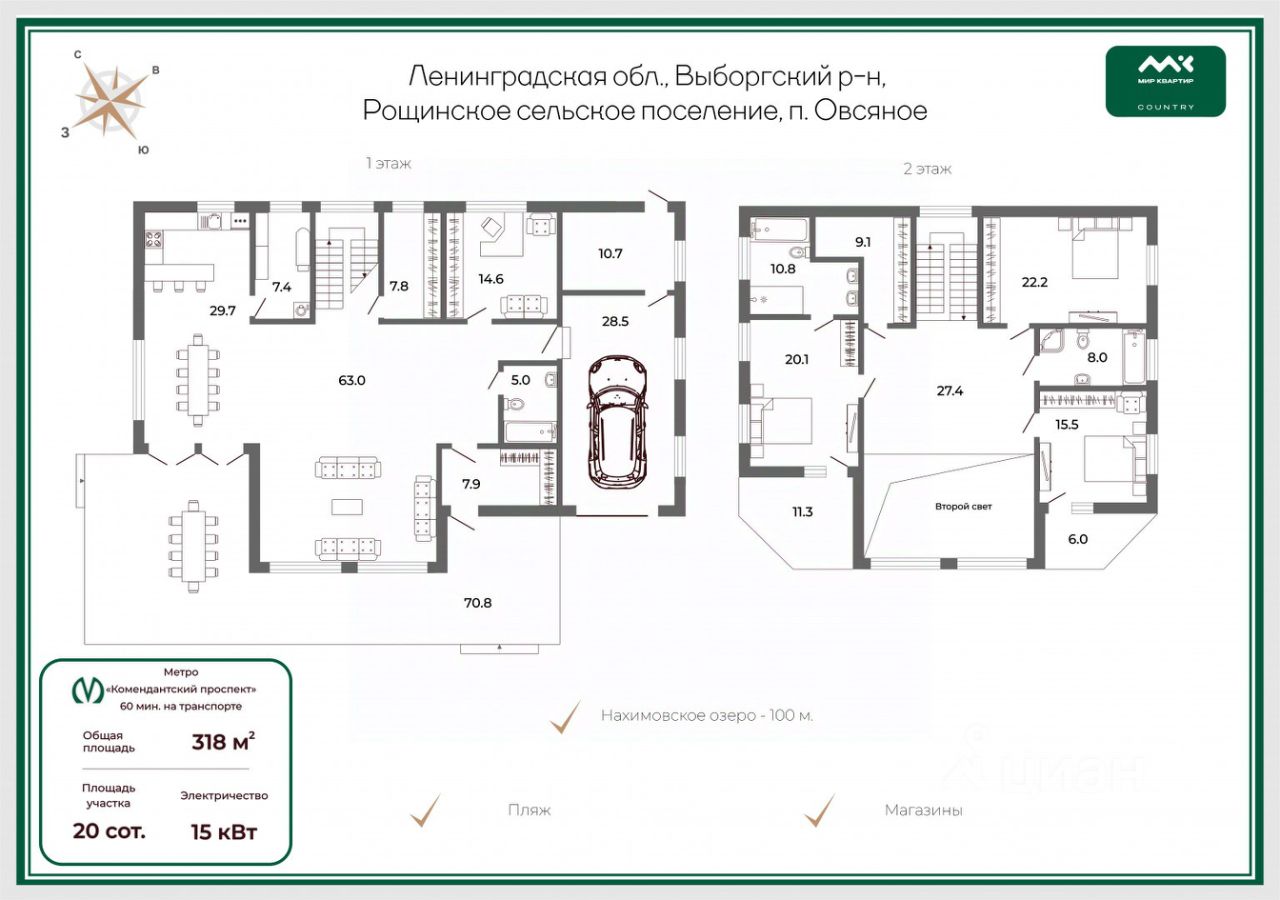 прихожую, гардеробную, кухню-гостиную со вторым светом (высота потолка 5,5 м!) - общей площадью почти 100 кв. м! Просторная гостиная позволит воплотить любые ваши самые смелые желания для комфортного проживания большой и дружной семьи! Кроме того, на 1 этаже расположены: гостевая комната 15 кв м, санузел, котельная, кладовая, постирочная и гараж с подъемными воротами (фирма Алютех).