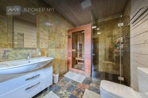 - на первом этаже расположен кабинет, гостевая спальня, просторная ванная комната с сауной, гардеробная, хозблок и кладовая, на втором этаже три спальни и еще одна ванная комната.