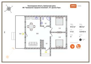 Две спальни и просторная кухня-гостинная; площадь теплого контура составляет 85 кв метров, 101 кв метр - с террасой и крыльцом.