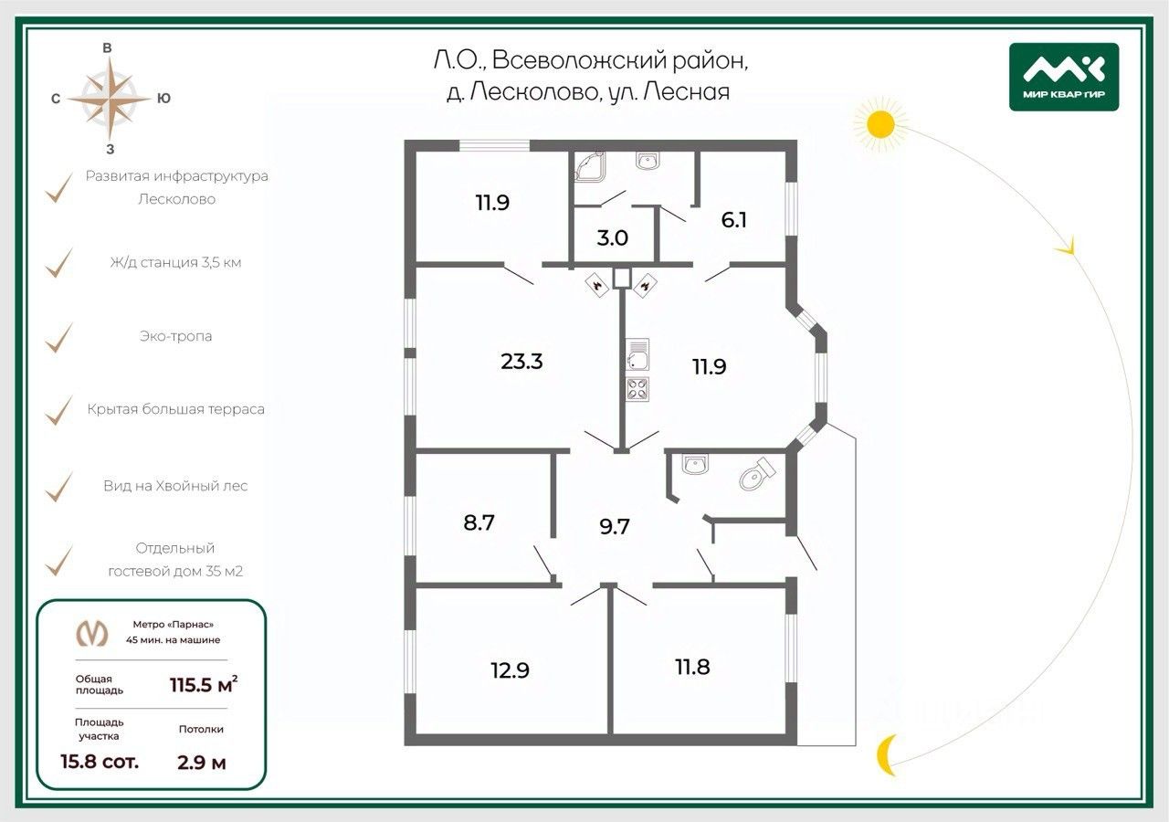 Арт. 123241959 Продается уютный одноэтажный дом для круглогодичного проживания на ровном участке 15 соток с видом на хвойный лес в п. Лесколово.