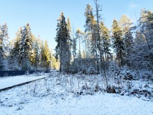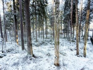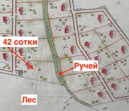 Участок непосредственно граничит с лесом (остальные стороны: подъезд, ручей, соседний участок). Участок с большими деревьями и интересным рельефом в сторону ручья.
