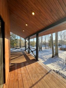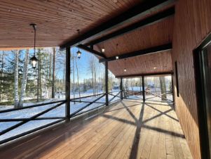 Дом для круглогодичного проживания построен по скандинавской технологии из сухого строганного бруса. Фундамент - железобетонный, каркас полностью антисептирован. Установлены энергоэффективные панорамные окна, тёплые полы во всех помещениях.