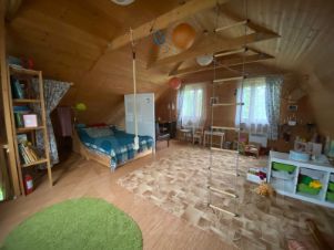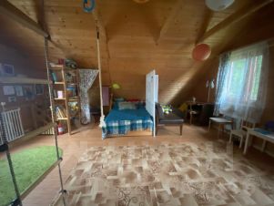 - участок ухоженный и обустроен: газон, клумбы, цветы, плодовые деревья, детская площадка (домик и песочница), просторно, много места для игр и отдыха,
