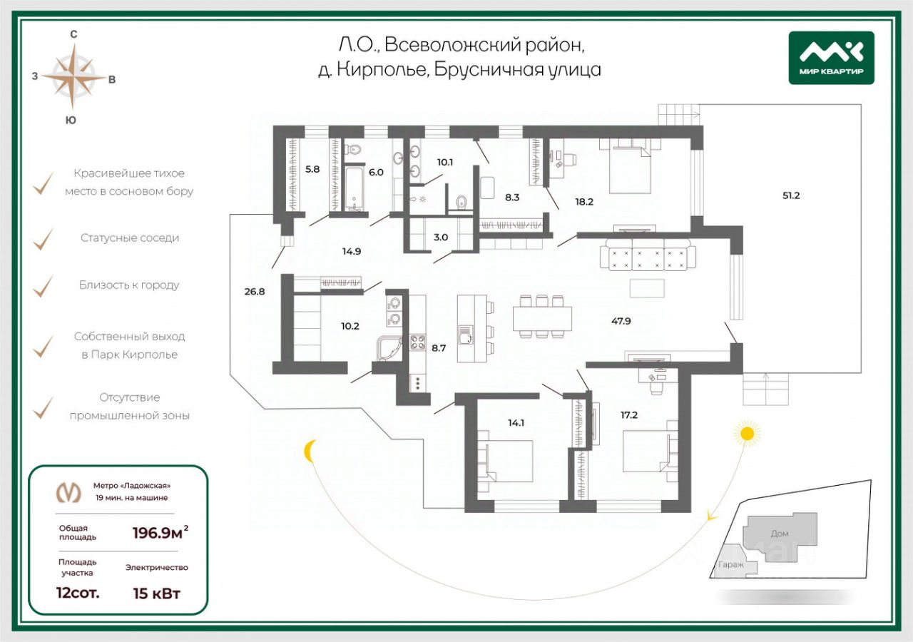 Арт. 125184391 Описание объекта Всеволожский район заслуженно пользуется популярностью благодаря двум ключевым преимуществам комфортной загородной жизни: близость к мегаполису и исключительные природные условия. Уважаемый покупатель, представляем вашему вниманию, впервые в продаже, прекрасный вариант загородного жилья просторный частный дом 196 м2, в уникальном коттеджном поселке "Янтарный Бор", расположенный всего в 20 минутах езды от Санкт-Петербурга. Это идеальный выбор для тех, кто ценит комфорт, природу и качество жизни вне шумного мегаполиса. Поселок расположен среди живописных пейзажей березовых и дубовых перелесков и сосновых лесов, обеспечивая чистый воздух и уникальную возможность ежедневного контакта с природой. Для любителей грибов и ягод все в пешей доступности. В 2-х км административный центр, частный детский сад "Вундеркинд", школа, супермаркет. На участке построен современный дом, отдельно стоящий гараж на две машины с хозяйственной пристройкой. Дом находится на угловом участке, в тихом месте, не на центральной улице, в окружении берез и сосен. О доме: В настоящее время в доме выполнены подготовительные работы для чистовой отделки, сделаны теплые водяные полы, разведены все коммуникации. Панорамное остекленение с выходом на большую террасу открывает перспективу с прекрасным видом на сосновый бор. Перед террасой просторный участок позволяет обустроить зону отдыха с беседкой, мангалом и зеленым газоном, создавая пространство для семейного досуга и встреч с друзьями. Этот дом подарит вам чувство гармонии, тишины и спокойствия, позволит наслаждаться каждым днем вдали от городской суеты и стресса. Продуманная планировка включает в себя 3 спальни, одна из которых мастер-спальня, 2 с/у, 2 гардеробные. При входе в дом расположен холл 14,9 м2, гардеробная 5,8 м2, бойлерная (котельная) 10,2 м2, ванная 6 м2, кладовая 3 м2, спальня 14,1 м2, спальня 17,2 м2, мастер-спальня 18 м2 с гардеробной 8,3 м2 и ванной 10,1 м2, , кухня 8,7 м2, гостиная 47,9 м2, с выходом на открытую террасу 51,2 м2, где можно в теплое время года позавтракать всей семьей, а вечером отдохнуть в сердце природы. Большая площадь гостиной позволяет осуществить любые ваши желания. Технические характеристики: Дом введен в эксплуатацию в августе 2025 года. Площадь дома: 196,9 м2. Этажность: 1- этажное. Высота потоков 2,8-3,7 м. Фундамент: свайный, усиленный монолитными железобетонными ростверками. Кровля: гибкая черепица, утепление 300 мм. Материал наружных стен: бетонные блоки, толщина 300, теплоизоляция из каменной ваты 200 "роквул скандик". Отделка фасада: фасадная штукатурка. Окна: теплый фасадный алюминий с 2-камерным стеклопакетом. Водосток: наружный. Выполнена фасадная подсветка. Отдельно стоящий гараж 55 м2, примыкающие к нему навес под автомобиль 25,9 м2 и хозблок 10,1 м2. Земельный участок: Площадь 12 соток. Ровный, сухой. Выполнены ландшафтные работы. По периметру выполнен забор, сделаны дорожки. Категория земель: для сельскохозяйственного использования. Коммуникации: Центральное водоснабжение заведено в дом, газоснабжение заведено в дом. Установлено все необходимое оборудование, газовый и электрический котел с накопительным баком. Электричество 3-х фазное, 15 кВт. Выполнены работы по разводке электросетей по дому. Выполнены работы по разводке сантехнических труб, горячей и холодной воды. Водяные полы. Кана