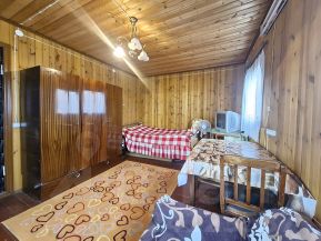 В доме три комнаты и кухня, небольшая веранда. Комната на втором этаже. Внутренняя отделка-вагонка.