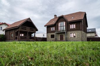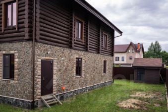 Комбинированная технология строительства: 1 этаж — красный кирпич, 2 и 3 ( мансардный) этажи — сруб ручной рубки под рубанок.