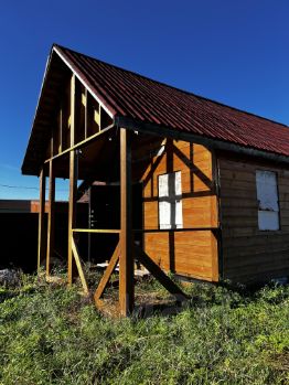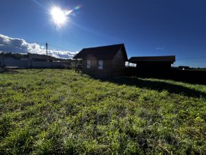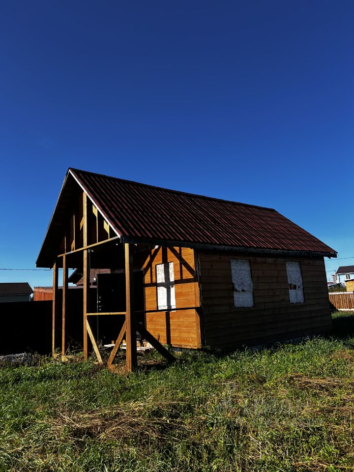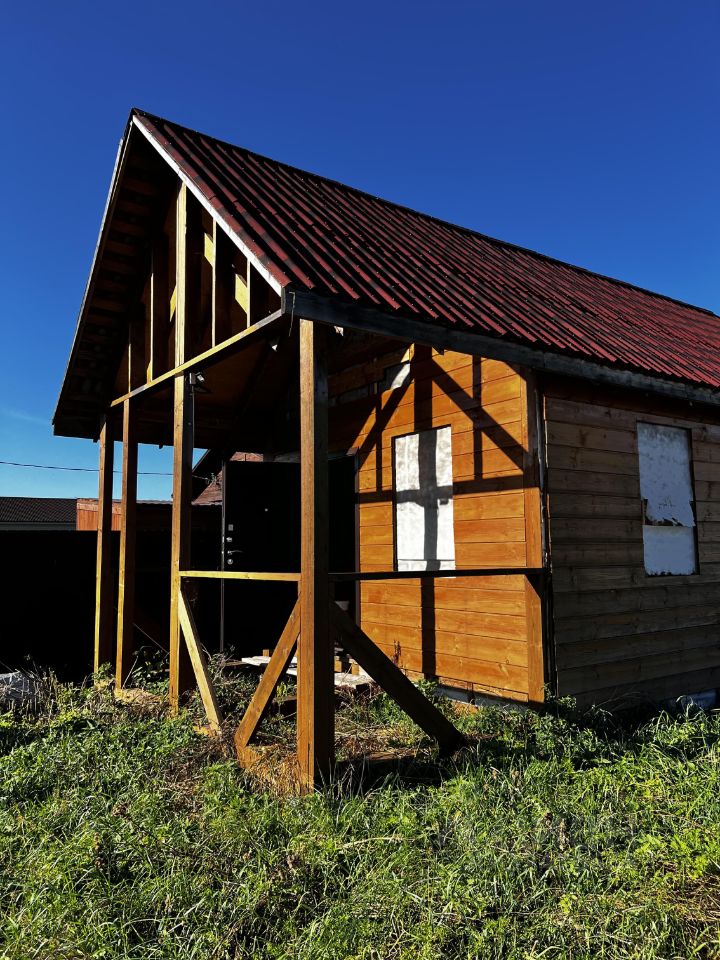 Без деревьев и кустов. С лицевой стороны установлен каркас под забор. в Дом: 4 • 6, в полтора этажа, стоит на бетонных блоках, обшит имитацией бруса, крыша ондулин. Внутри без отделки. Прекрасно подойдет как под баню, так и для проживания летом.