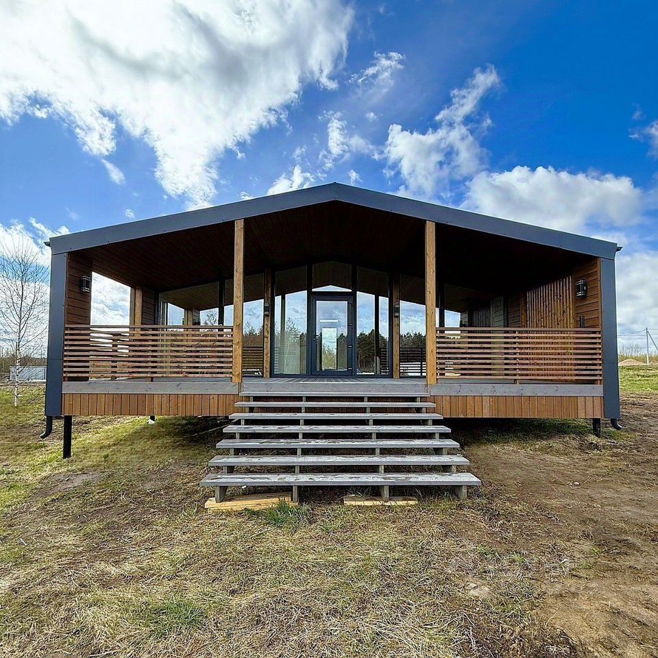 Просторная веранда (26 м²) и панорамные окна создают ощущение свободы и наполняют дом светом.