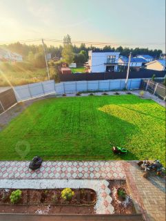 Участок ровный, сухой (выполнены дренаж и подсыпка), огорожен забором, вдоль которого высажены хвойные деревья. Также выращен аккуратный газон, цветы. Парковочные места и дорожки вымощены тротуарной плиткой, для въезда — автоматические ворота.