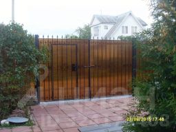 Участок окружен забором на бетонном основании. Красивые ворота.