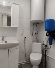 - В санузле 1 этажа разведена сантехника под ключ (установлены: ванна, унитаз, тумба с раковиной, зеркало, водонагреватель), полипропиленовые трубы, теплый пол.