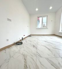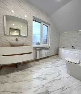 Силовой каркас из газоблоков, соблюдены все строительные нормы. Первый этаж с теплыми полами и гранитной плиткой, второй этаж — ламинат 33 класса, обогрев — батареи.