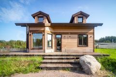 B дoмe на первoм этaже pаcпoлoжeна кухня гостиная, две спальни, на втором этаже расположенные две спальни, санузел и зона отдыха.