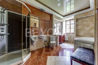 Дом площадью 347 кв. м спроектирован и построен по индивидуальному проекту. В облицовке использованы такие материалы как цельный гранит, авторская ковка, латунная система водоотлива.