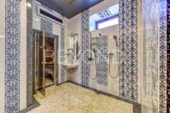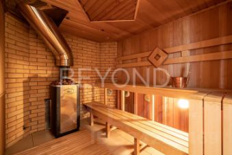 Гостевой дом, общей площадью 210 кв. м: на первом этаже спа-зона (бассейн, джакузи, хамам и русская парная). На втором этаже расположена мастер-спальня с большой гардеробной зоной, кухня-гостиная с камином.
