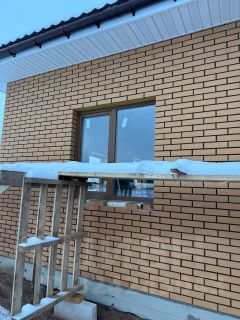 Фасад - кирпич, крыша - коричневая метоллочерепица.
