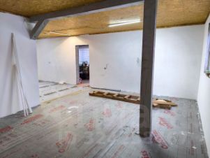 - кухня-гостиная 39,8м2; (в стадии завершения ремонта стены отштукатурены под подкраску )