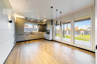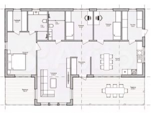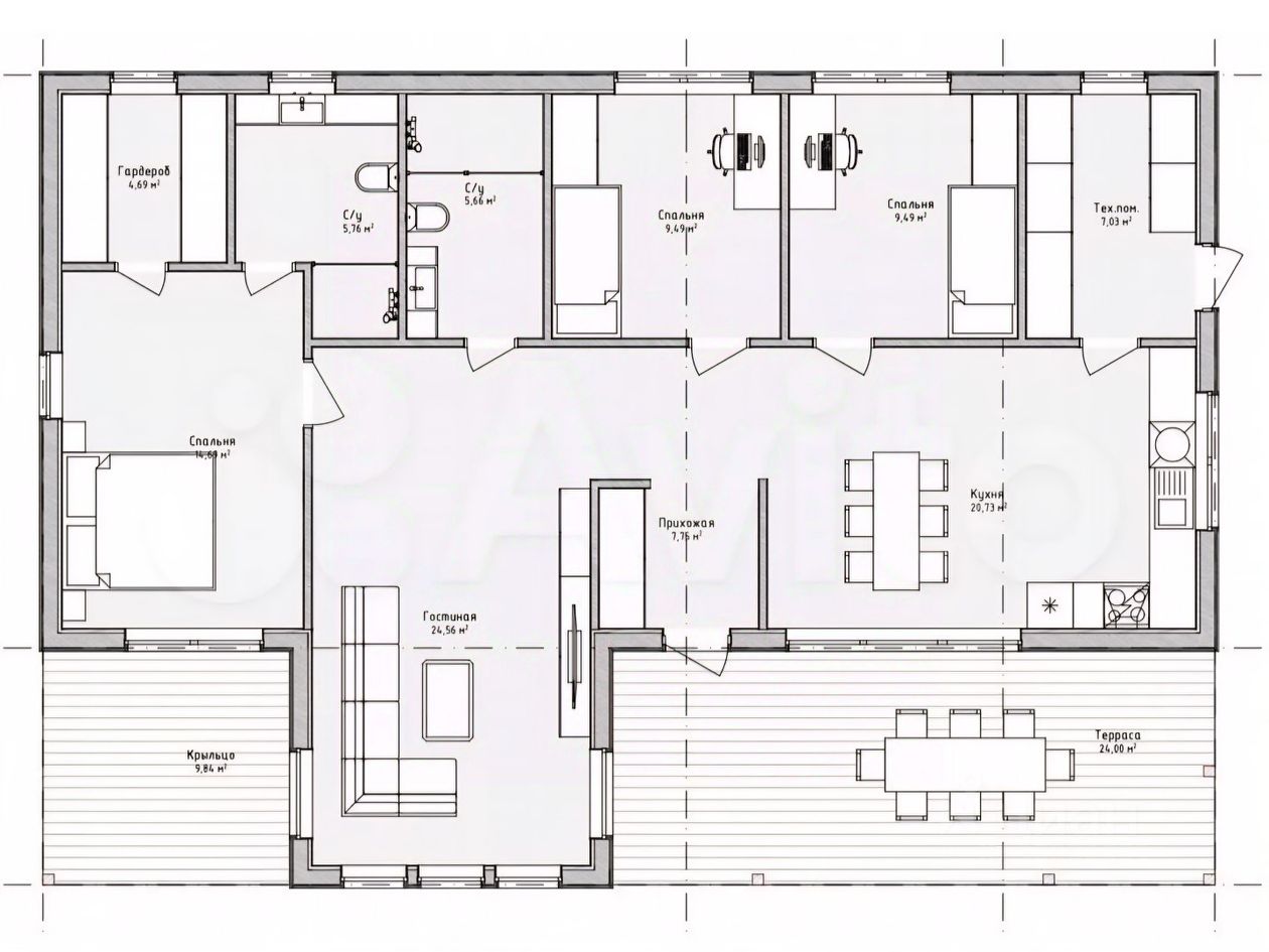 Просторная гостиная с панорамными окнами, кухня-столовая, 3 спальни, 2 санузла, гардеробная, техпомещение.