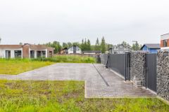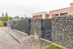 Забор по фасаду выполнен из габионов на ЖБ фундаменте с вставками из заборных секций, забор между соседями выполнен из заборной сетки.