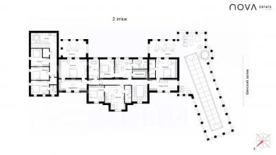 Второй этаж спроектирован как приватная зона: мастер-спальни с собственными ванными комнатами и гардеробами, выходами на открытые террасы и балконы, а также кабинет, библиотека и лаунж-зоны, в том числе на эксплуатируемой кровле, где можно оборудовать зону отдыха на свежем воздухе.