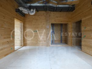 Дизайн разработан индивидуально, архитектура сочетает монолитный цоколь и два надземных этажа из клееного бруса из карельской сосны сечением 270270 мм. На первом этаже — просторная гостиная, столовая, кухня, каминный зал с двойным светом (48 кв.м), терраса BBQ 37,5 кв.м, хамам, парная, купель, массажная и раздевалки. На втором — четыре спальни с ванными комнатами и библиотека. В цоколе — технические помещения.