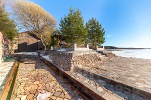 Установлена система автополива, выполнен ландшафтный дизайн участка и прибрежной территории, установлены скамейки и организованы несколько зон отдыха, а также