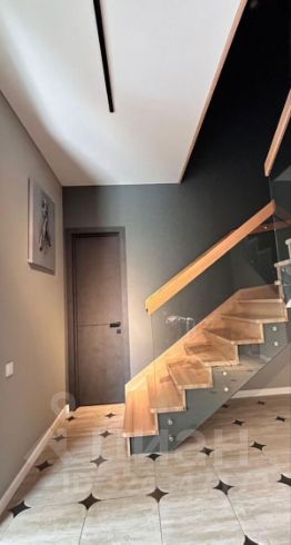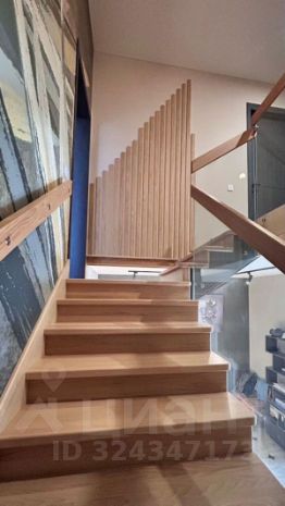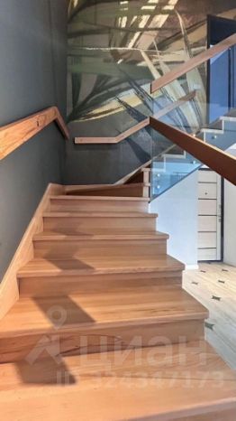 Лестница на 2-й этаж ж/бетонная с отделкой из натурального бука и стеклянным ограждением.