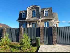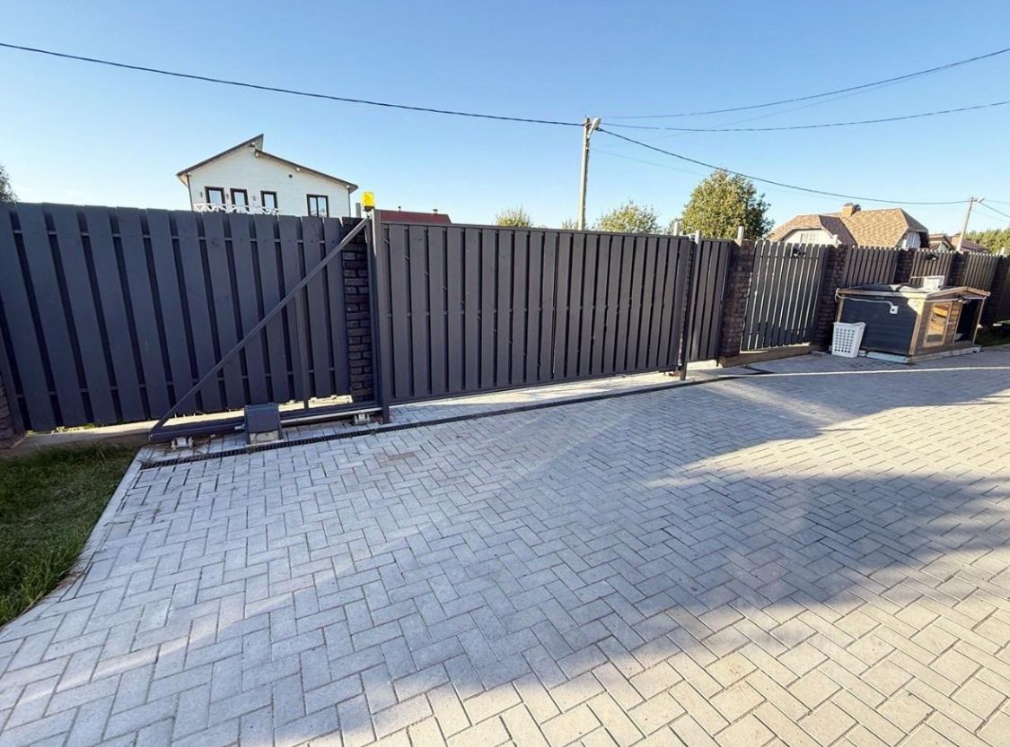 Автоматические ворота. Декоративный кирпич под заказ на столбах забора, а также деревянные доски из сосны камерной сушки по забору на ленточном фундаменте.