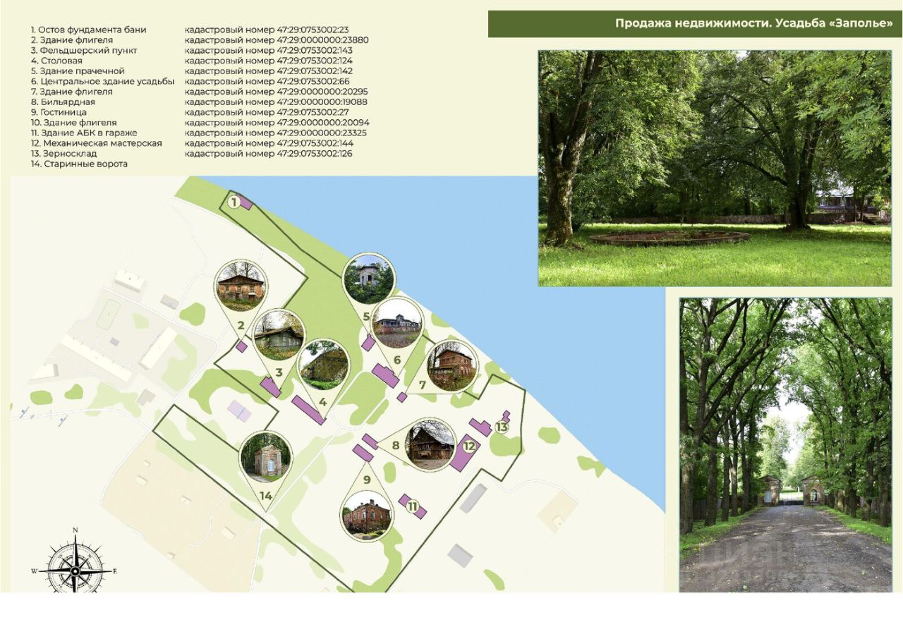Продается Усадьба "Заполье". Объект культурного наследия, исторический памятник, включающий в себя 14 объектов капитального строительства, находящихся в собственности на участке земли 10,3 га (в аренде на 49 лет с правом преимущественного выкупа). На территории функционирует отреставрированная гостиница (324 м2) на 10 номеров ( 9 -2х местных , 1 -4х местный). Другие объекты нуждаются в реконструкции. Продажа одним лотом.