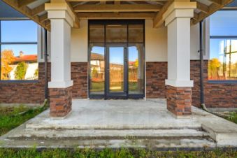 - Окна главного входа и лестничного пролёта — алюминиевые