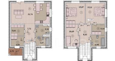 Планировка дома: Наши архитекторы наградили дом максимально продуманной и эргономичной планировкой. Достаточно просторные спальни вынесены на второй этаж, все члены семьи могут рассчитывать на тишину и уединение в своем личном пространстве.