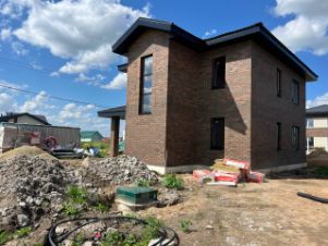 Выполнен теплый контур дома, установлены двухкамерные окна, полностью завершены отделочные работы фасадным облицовочным кирпичом, установлена входная дверь
