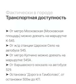 - в 4 км находятся г. Коммунар со всеми необходимыми объектами инфраструктуры . В 10 минутах езды города Павловск и Пушкин.