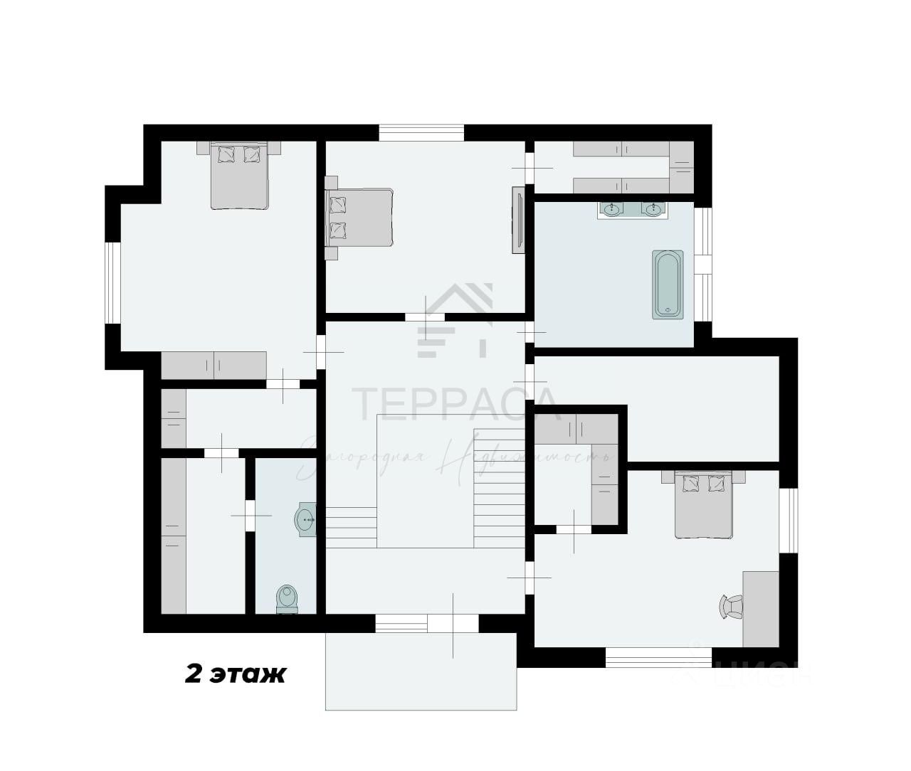 2 этаж - 3 спальни (в каждой - отдельная гардеробная комната), холл с выходом на балкон, 2 санузла и прачечная.