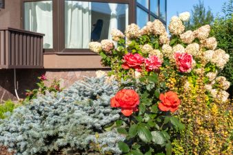 Декоративные растения на фоне зеленого газона делают ландшафт более живописным и привлекательным.