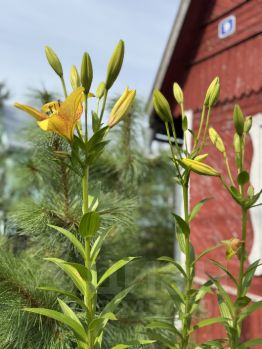 много кустарников, цветов, сирень, смородина, ели, туи и сосны.