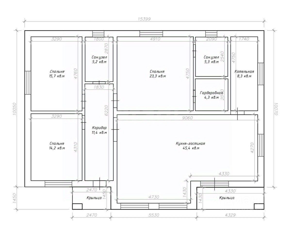 Три спальни (общая жилая площадь — 53,2 кв. м) и просторная кухня- гостиная со вторым светом (45,4 кв. м)