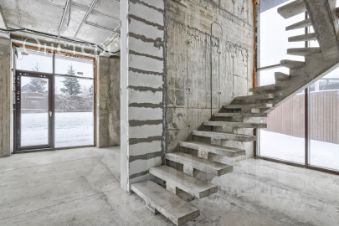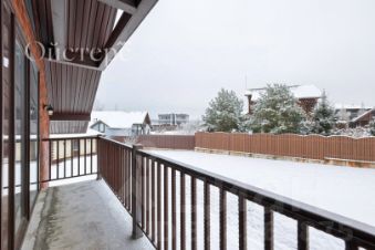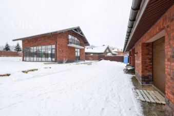 Основной дом площадью 210 м² построен по монолитной технологии и облицован клинкерной плиткой. На первом этаже — кухня-гостиная с панорамным остеклением, санузел и котельная. На втором — три спальни, два балкона и дополнительный санузел.
