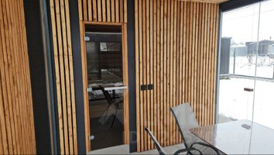 Капитальные конструкции: фундаментная плита с теплыми водяными полами, стены из газобетона с наружной отделкой с вент-фасадом с алюминиево-композитными панелями, крыша плоская монолитная с ПВХ-мембраной. Теплая стальная входная дверь Hormann Termo65 (пр-во Германия), входные двери на остекленное крыльцо и на террасу с алюминиевым профилем с доводчиками, двухкамерные окна с теплым 5-камерным профилем 70мм Gealan с фурнитурой ROTO (пр-во Германия), на террасе верхнеподвесная система раздвижного остекления Lumon (пр-во Финляндия), на хозблоках роллеты с электроприводом.