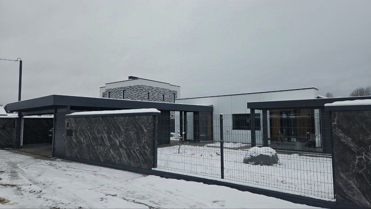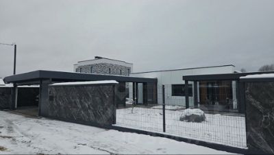 Въездная группа: заезд сразу на участок под автонавес (7х7 м) для параллельной парковки 2х авто с подъемными воротами, калитка, электропривод ворот Hormann (пр-во Германия), системы контроля доступа с FaceID. Система видеонаблюдения периметра домовладения с уличными камерами с высоким разрешением. Фасадный забор на монолитном фундаменте с отделкой гибкой керамикой Phomi.