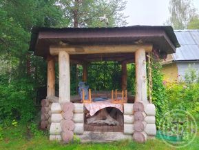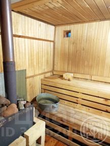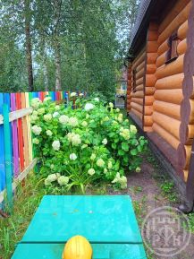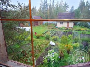 Участок площадью 8,7 соток ровный, сухой и ухоженный, с высаженными кустарниками. На территории есть бревенчатая беседка, баня, сарай, уличный туалет, два колодца для полива и теплица. Перед домом устроен дренаж.